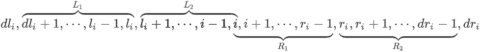 - $L\in[l_i+1,i],R\in[r_i,dr_i-1]$,区间包含了 $r_i$,记作 $[L_2,R_2]$。