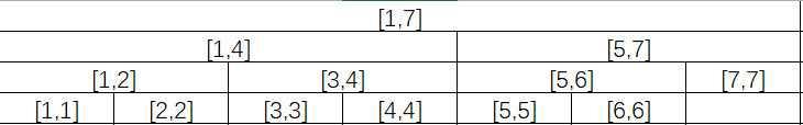 如图,线段树将原区间 $[1,7]$ 拆成 $[1,4],[5,7]$,$[1,4]$ 又拆成 $[1,2],[3,4]$……直到拆成区间大小为 $1$。