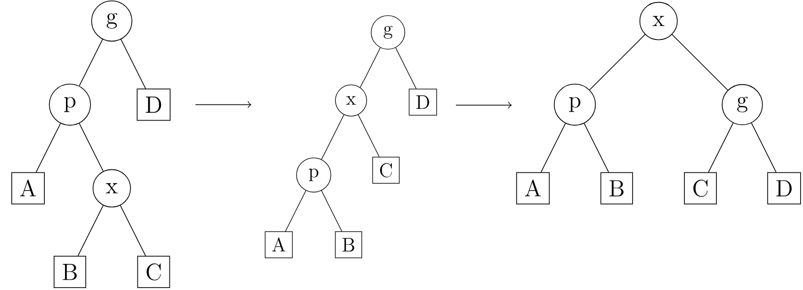 假设对 $x$ 进行 splay 操作,记 $p$ 为本次 rotate 操作之前的 $\textit{father}_x$,$g$ 为本次 rotate 操作之前的 $\textit{father}_p$。