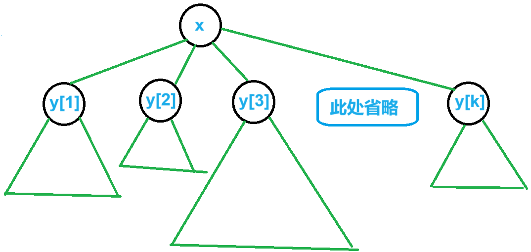 对于节点 $x$ 和其子节点 $y_1,y_2,y_3,\cdots,y_k$,我们先考虑一下如何传递。