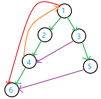 图中绿色为普通树边,橙色为回溯边,红色为前向边,紫色为横边。