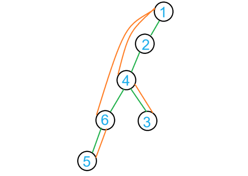 例如图中搜索到 $4$ 之后,按照 DFS 的原则会先后搜索 $3,6$,不可能只搜索 $6$ 然后回退至 $1$ 再搜索到 $3$,然后连横边。