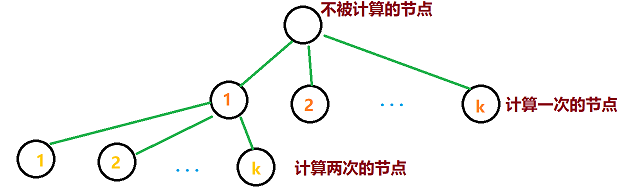 则可以解释上文的结论,根节点的 $x$ 级子节点有 $k^x$ 个,而这些子节点的答案被统计了 $x$ 次(合并一次就会被统计一次)。