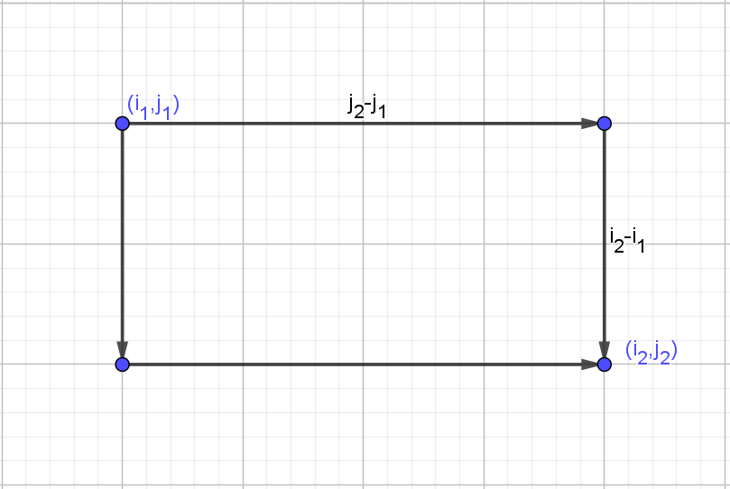 考虑从左上角 $(i_1,j_1)$ 走到右下角 $(i_2,j_2)$,只拐一次弯。