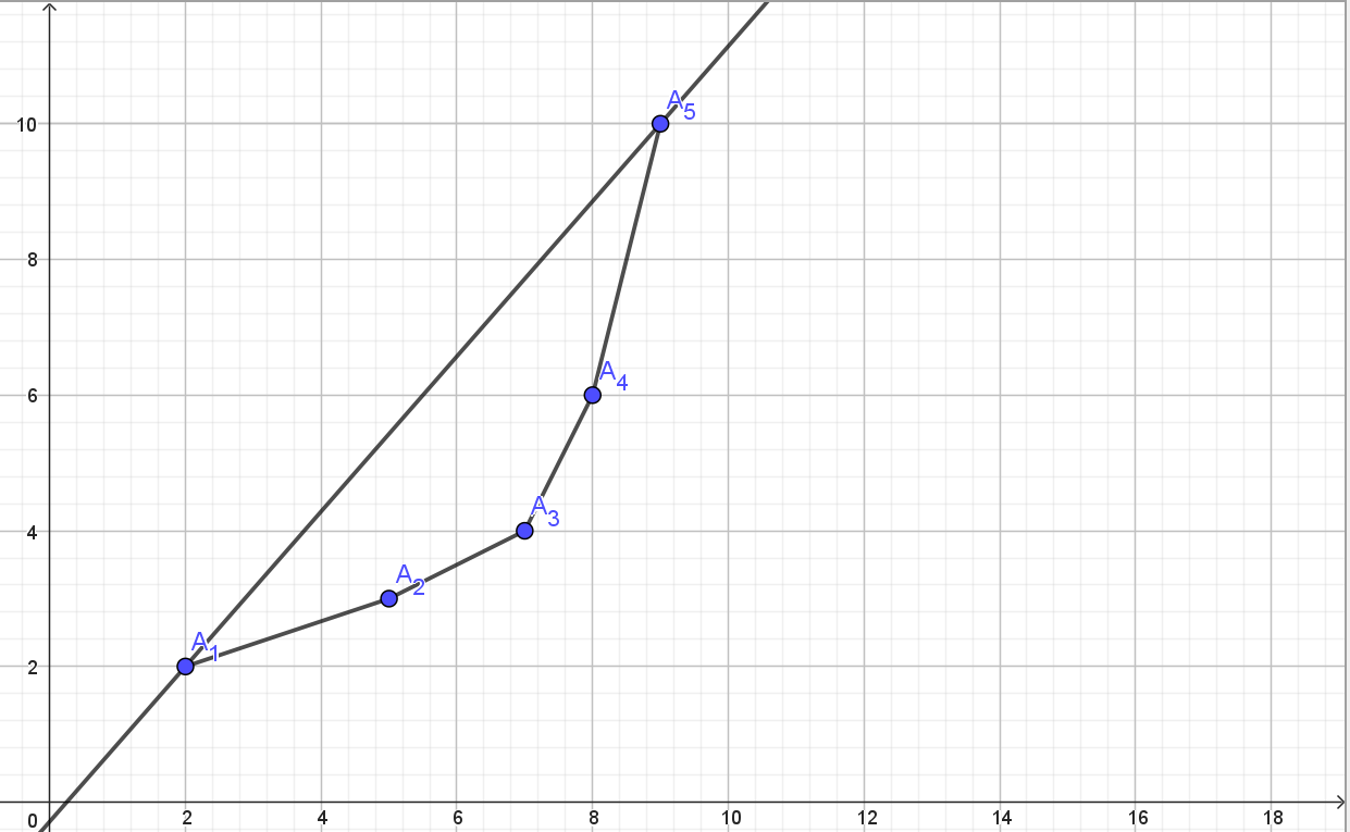 这样的操作实际上也就是维护一个凸壳。所谓凸壳,在斜率优化中即各边斜率单调的图形(其实也可以称为「凸包」,但是不严谨)。如图所示便是一个下凸壳(斜率单调不降,也是本题所维护的):